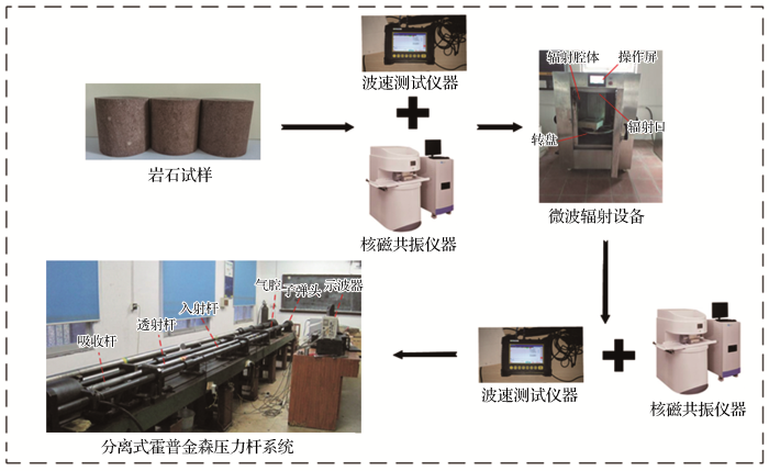 本次试验在5 kW和3 kW功率水平下对砂岩进行不同时间的辐射,在辐射之前分别用波速测试仪和核磁共振仪器对砂岩的波速和孔隙率进行测试。微波辐射后,再次测试波速和孔隙度。最终,采用SHPB仪器测试岩石的动态压缩强度。所有岩石试样测试时的温度均为室温,降温方式为自然降温。图2所示为试验研究主要流程示意图。