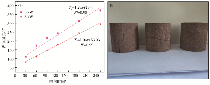 砂岩在微波辐射过程中,吸波矿物质会吸收微波而使岩石升温。岩石的表面温度随辐射时间的变化情况如图3所示。试验结果显示,砂岩在受到微波辐射后,其表面温度上升迅速,试样表面温度与辐射时间呈近似直线关系上升。在5 kW功率下辐射60 s后岩石表面温度大于在3 kW功率下辐射100 s,以相同输入能量对比来看,增加功率能够节约加热时间,同时还可对试样造成更大损伤。砂岩在5 kW功率下辐射240 s以后,其表面产生了肉眼可见的裂纹。但在辐射240 s之前,试样并没有肉眼可见的裂纹出现。在3 kW功率下辐射240 s之后,试样也不会出现明显的裂纹。