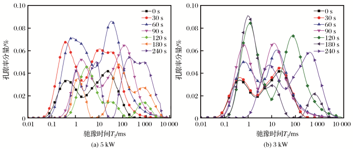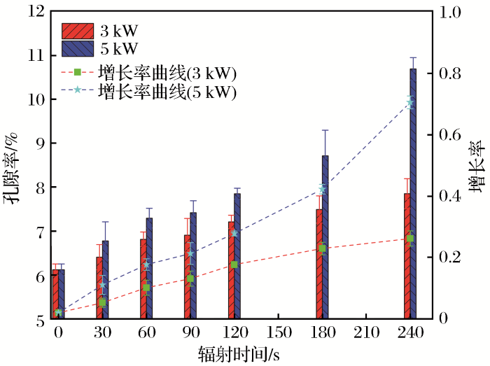 如图5所示,对于未受微波辐射的砂岩,其T2图有2个峰,分别介于0.1~1.0 ms和10~30 ms,说明砂岩试样未经过辐射时,其内部孔隙主要为微孔隙(0.1~1.0 ms)和中等孔隙(10~30 ms)。砂岩在5 kW功率下辐射30 s后,其孔隙率分量明显增大,但是峰值位置并没有发生大的变化,说明辐射后岩石微孔隙增多而大孔隙变化不大。在3 kW功率下辐射30 s后,砂岩孔隙率分量和峰值位置略微发生变化。随着辐射时间的增加,T2图谱中各曲线的峰值发生明显增大的同时有向右移动的趋势,说明岩石试样内部的孔隙在不断增多且变大。在5 kW功率水平下的T2图谱中,30 s和60 s的曲线主要表现为孔隙率分量增大,而后曲线表现出分量降低但是峰值右移幅度增大。在3 kW功率水平下的T2图谱中,30,60,90,120 s的曲线主要表现为孔隙率分量增大,而后曲线表现出分量降低但是峰值右移幅度增大。对于5 kW功率水平下,在微波辐射120 s以后,砂岩试样T2图谱出现第3个峰值(800~1 200 ms),可能预示着在热应力的作用下,砂岩内部已经产生裂纹[15]。通过Core软件对试样T2图谱分析可得砂岩的孔隙率,如图6所示。对比微波辐射前后的孔隙率,发现辐射后的孔隙率明显增大。在5 kW功率水平下,在微波辐射的前180 s,砂岩孔隙率增长率呈直线变化,随后增长率突然增大。在3 kW功率水平下,微波辐射0~120 s孔隙率增长率也呈直线变化但其斜率比5 kW的情况更小,随后增长率变缓,与5 kW功率的情况不同。