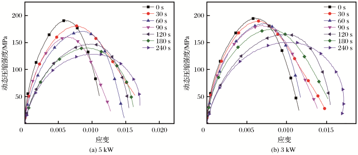 由于SHPB试验中岩石的强度与应变率有关,为了减少控制变量对试验的影响,同时便于数据对比分析,对砂岩试样的试冲结果进行分析后确定此次试验均采用0.9 MPa的气压,将子弹头推到气缸底部后对砂岩进行冲击,每一个辐射时间冲击3个试样。微波辐射后砂岩动态压缩应力应变如图7所示。岩石的动态压缩力学强度曲线主要划分为3个阶段:弹性阶段、屈服阶段和破坏阶段。所有砂岩经过微波辐射后,其强度曲线都经历了这3个阶段[16-17]。由于应力波在岩石试样中传播速度很快,冲击过程中岩石内部裂隙和孔隙无法在短时间内闭合,所以曲线一开始就进入了弹性阶段。随着时间的增加,其弹性阶段的斜率明显变小,且在更高的功率水平下,其弹性阶段历时越短。弹性阶段后,岩石就进入屈服阶段,可以看出辐射时间越长、功率越高,岩石进入屈服阶段越快。进入屈服阶段后,岩石发生破坏。岩石在微波辐射后,应力—应变曲线峰值点发生了明显的右移,且其峰值不断变小,峰值应变随着辐射时间的增加而增加。