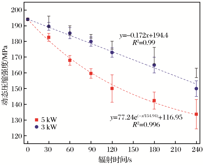 可见功率越高则强度下降的幅度也越大,且随着辐射时间的增加,岩石动态冲击后强度离散性变大。
