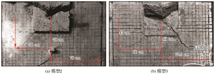 为研究充填体爆破后破坏区域,本文选取模型2、模型3爆破后充填体表观裂纹情况展开详细分析。充填体裂纹扩展情况如图6所示。