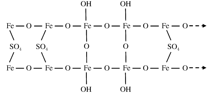 ... 在IOB治理中,黄铁矾和施氏矿物是最常见的2种除砷矿物.其中黄铁矾的生成速度和一次性转化率均远高于施氏矿物且更稳定,但该过程需加入高浓度的一价阳离子尤其是K+,在实际大规模治理AMD时会带来较高的试剂成本.施氏矿物的生成虽不用添加一价阳离子且对砷的吸持量高于黄铁矾,但其矿化速度慢、矿化率低.如式(1)和式(2)所示,黄铁矾和施氏矿物的成矿过程均会产酸且后者产酸更多,但施氏矿物本身性质不稳定,在pH值较低时砷会被再次释放出来,造成二次污染[28].如图2所示,研究发现砷不仅以与施氏矿物表面羟基络合的方式被吸附,还会进入施氏矿物内部与形成竞争吸附导致的脱除,进而导致施氏矿物[Fe8O8(OH)6SO4]向针铁矿(α-FeOOH)的缓慢转化,而针铁矿对砷的吸附量远低于施氏矿物,这一转化可能会造成砷的再次释放,而相关的稳定性研究比较缺乏[29-30]. ...