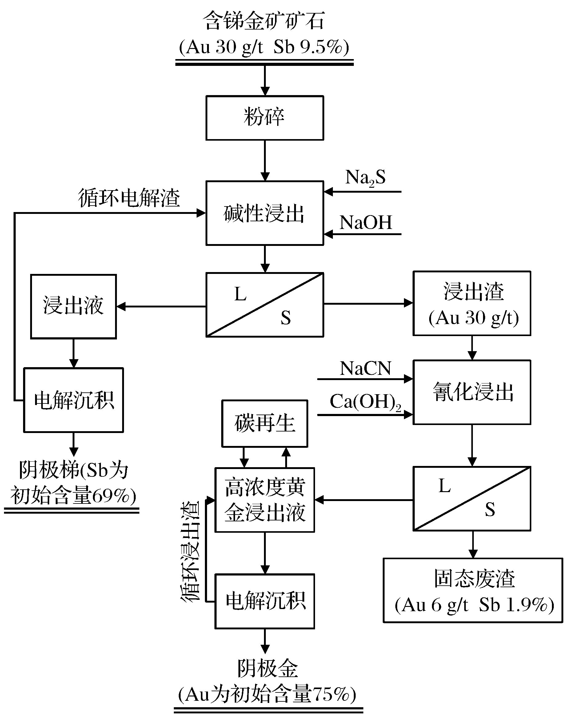 | 图1 含锑金矿碱性浸出及电解沉积工艺流程图[ |