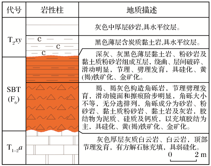 ... 矿区尺度上,赖子山背斜近核部的罗楼组或许满组与吴家坪组/礁灰岩之间(F1 )、新苑组与安顺组之间(F5 、F6 ),当成矿期流体沿深部构造运移至滑脱构造破碎带时,受上覆黏土岩屏蔽作用,流体主要沿滑脱构造破碎带运移,流体温度降低、压力减小,并与围岩发生水岩反应[20 -22 ] ,从而形成构造蚀变体(SBT)[2 -9 ] ,产状与岩性界面一致,倾向NE或SW,倾角为5°~56°,其中硅化角砾蚀变(矿化)岩发育,角砾成分主要为砂岩、粉砂岩和黏土岩,少量为灰岩或白云岩,角砾大小不等,一般为0.1~20.0 cm,多呈棱角状,钙质及泥质胶结,擦痕阶步明显,层间滑动明显. ...