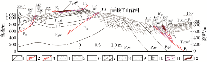 T2 xm 4 -许满组四段;T2 xm 3 -许满组三段;T2 xy2 -新苑组二段;T1-2 a -安顺组;T1 l -罗楼组;P3 jh -礁灰岩;P3 w -吴家坪组;P2 m -茅口组;1.地层界线;2.逆断层;3.正断层;4.砂岩;5.黏土岩;6.灰岩;7.生物灰岩;8.泥灰岩;9.角砾岩;10.产状;11.构造蚀变体;12.金矿体