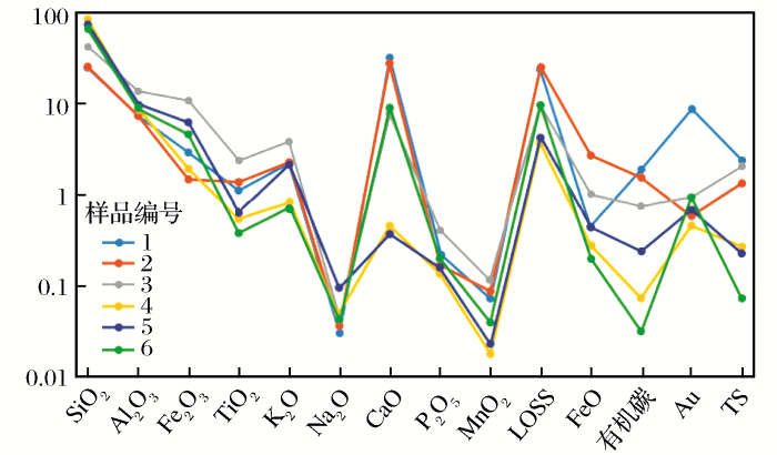 ... [18 ].Fe2 O3 含量较高,可能与黄铁矿化有关;铝、钾含量表明金矿床中含有一定量的黏土矿物,是成矿过程中黏土化的结果. ...