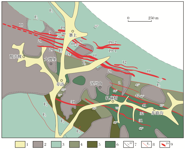 1.下二叠统十里铺组下段;2.上泥盆统大草滩组上段;3.上泥盆统大草滩组下段;4.中泥盆统黄家沟组;5.中泥盆统安家岔组;6.印支—燕山期岩浆岩;7.矿脉及矿体;8.断层