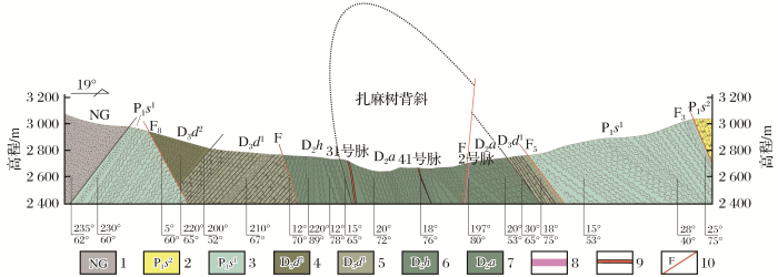 国营牛场背斜西段的卓洛—扎麻树背斜是寨上矿区的主体构造。背斜核部地层为中泥盆统(D2),翼部地层为上泥盆统(D3)和下二叠统(P1)。该褶皱为典型背斜结构,东侧正常,西侧为一个北倾倒转背斜,认为该结构为二次褶皱作用形成。北翼褶皱产状正常,地层较薄,倾角较缓;南翼产状倒转,地层较厚,倾角较陡。扎麻树背斜对主干断裂和容矿断裂(矿脉)的形成和分布起着重要的控制作用(图4)。
