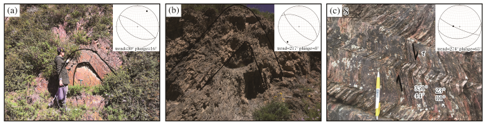 膝折主要发生在发育面理的岩石或岩性均一的脆性薄层岩层中,是兼备剪切褶皱作用和弯滑作用2种特征的一种独特的褶皱作用。一般来说,这种构造的形成方式为岩层在一定围岩(如钙质板岩等易发生脆性破裂的岩性)限制下,围绕一个相当于轴面的膝折面折弯而成尖棱褶皱。一般是岩层受到与面理或层理略微斜交或平行的剪切应力作用,发生了剪切滑动,但由于受到垂直方向上的正应力限制,岩层滑动面在小范围内发生突然转折。在泥周山附近可见较多膝折现象,如图5(c)所示。主要发育在薄层钙质板岩中,由于缺少软弱层或软弱层很薄,强硬层就发育为尖棱褶皱,即膝折。目前认为这种膝折的形成与SN向剪切应力有关,为该应力场持续作用的结果。