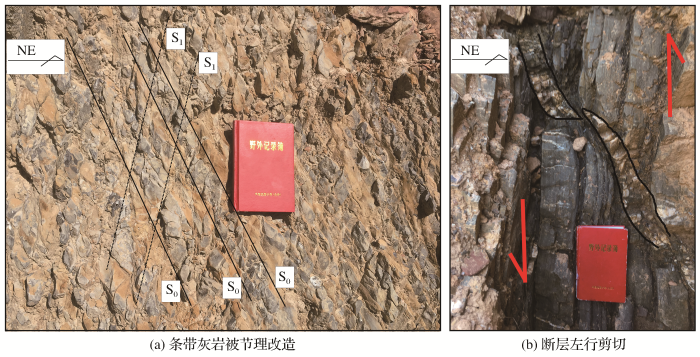 在扎麻树附近可见灰岩与泥岩形成的条带灰岩受后期节理改造而形成的密集破裂,如图7(a)所示。岩石中的原生面理S0由于构造破碎而被改造,表现出后期构造形成的次生面理S1。