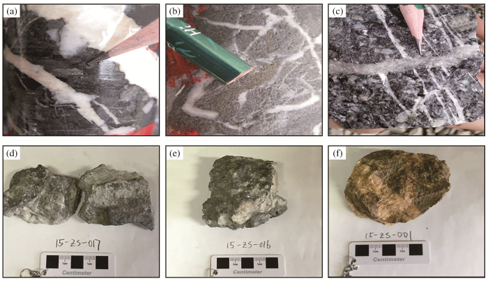(3)岩浆岩。寨上矿区岩浆岩体大规模出露,在北矿带发现碳酸盐化闪长玢岩脉,仅发育于个别钻孔和平峒中。岩脉中发育少量黄铜矿和黄铁矿等硫化物[25],金含量也明显高于地层中的金含量,说明其与该地区金成矿存在一定联系。