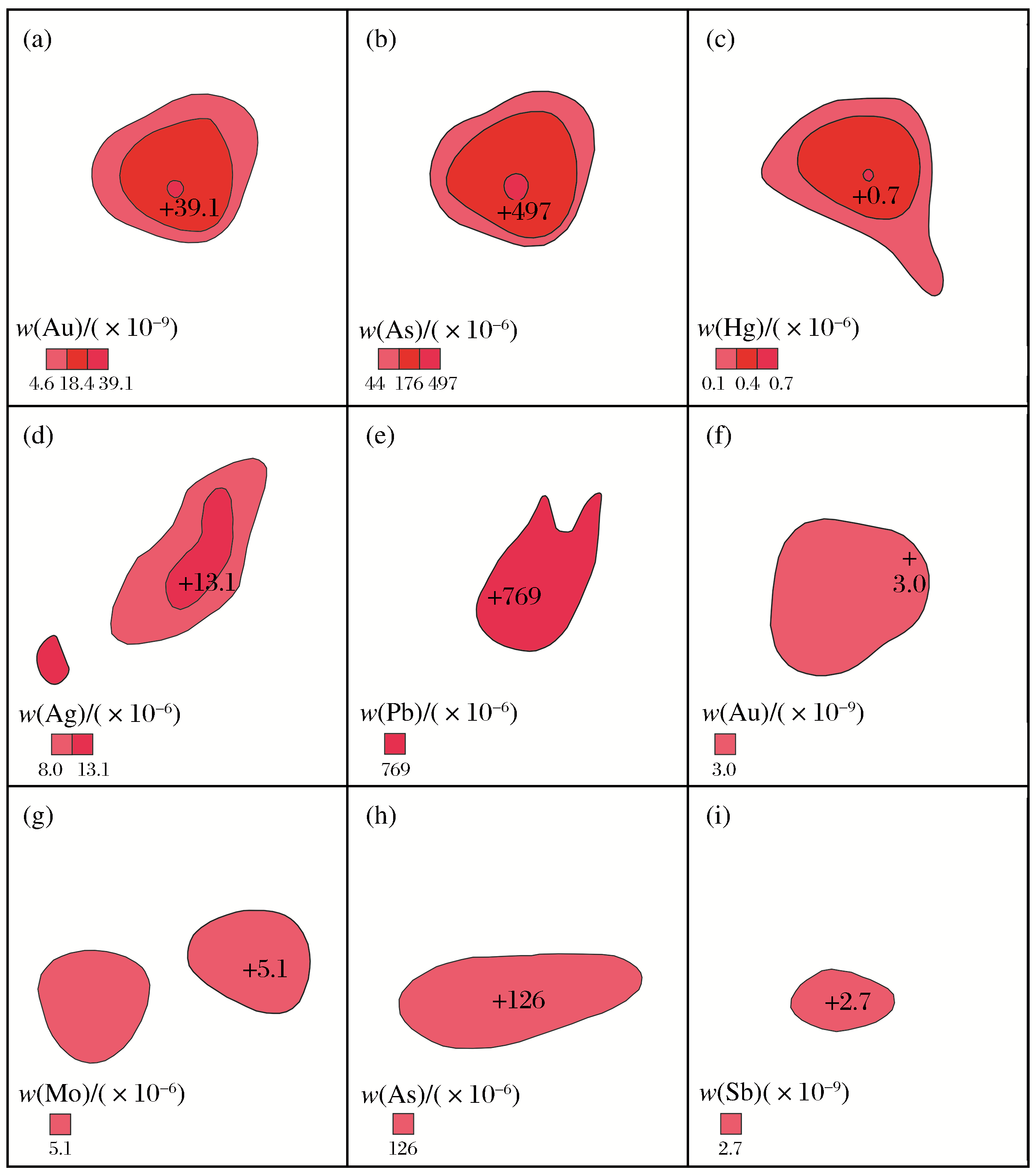 | 图3 研究区水系沉积物异常解析图 (a)(b)(c)AS-3;(d)(e)AS-4;(f)(g)AS-1;(h)(i)AS-2 |