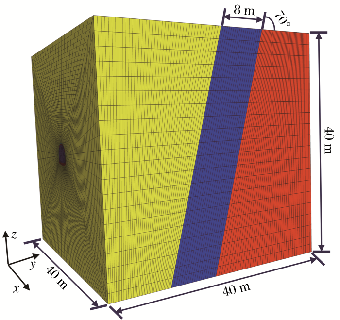 计算采用有限差分软件FLAC3D。根据挑水河磷矿巷道工程实际施工情况,计算模型选取过断层软破段巷道作为研究对象。巷道埋深250 m,模型尺寸为40 m×40 m×40 m(长×宽×高),断层厚度为8 m,倾角为75°。巷道为半圆拱巷道,底宽为3.9 m,墙高为1.25 m,半圆拱半径为1.95 m。为观测巷道围岩与支护破坏情况,采用摩尔—库仑模型。侧压力系数参照磷矿所在地宜昌地区取λ=1.2。按照挑水河磷矿工程实际,最终建立的三维数值计算模型如图2所示。其中,模型侧面及底面为固定边界,上表面未进行约束。根据模型深度以及岩体容重对模型施加垂直应力,并按照宜昌地区侧压力系数λ=1.2施加水平应力,施加应力为梯度应力。地层物理力学参数见表1。结合挑水河磷矿过断层软破段巷道现有支护方案,选用锚喷支护和砌碹支护方式。锚杆选用Φ25 mm全长粘结式锚杆,采用cable结构单元;喷射混凝土选用c25强度等级,碹体选用c40强度混凝土,采用实体单元。锚杆、喷射混凝土和碹体具体力学参数见表2。