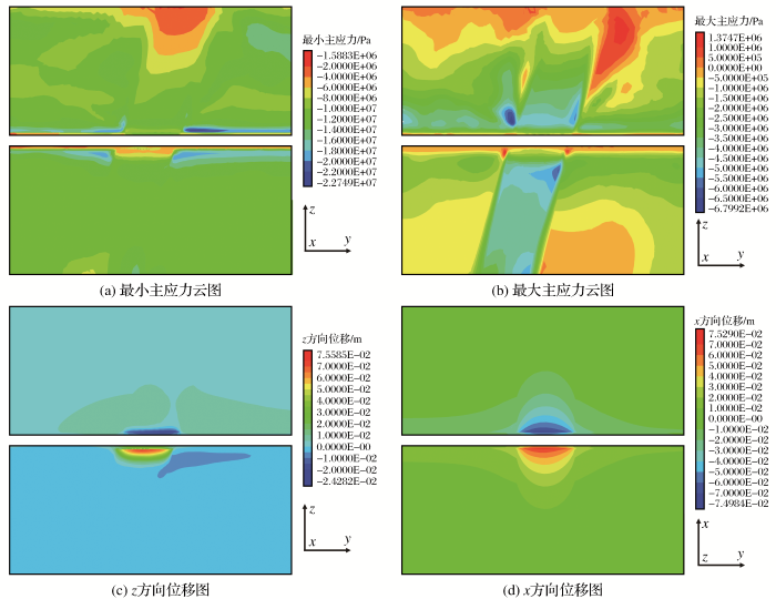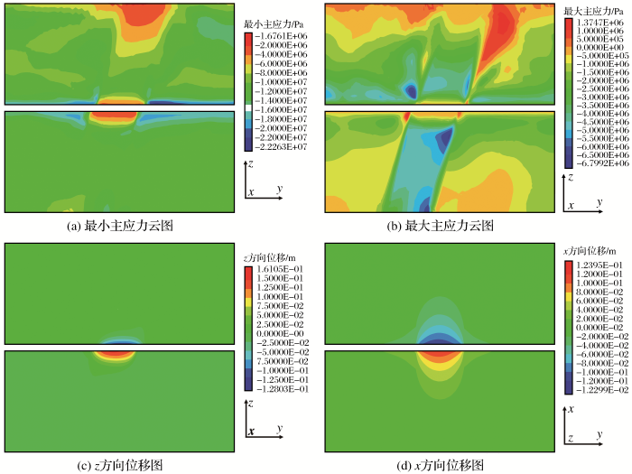 | 地层 | 密度/ (×103 kg·m-3) | 体积模量/GPa | 切变模量/GPa | 黏聚力/MPa | 内摩擦角/(°) | 抗拉强度/MPa |