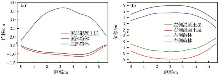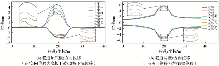 (a)断层处支护体z方向位移(正/负向位移为底部上鼓/顶部下沉位移);(b)断层处支护体x方向位移(正/负向位移为左/右侧位移)