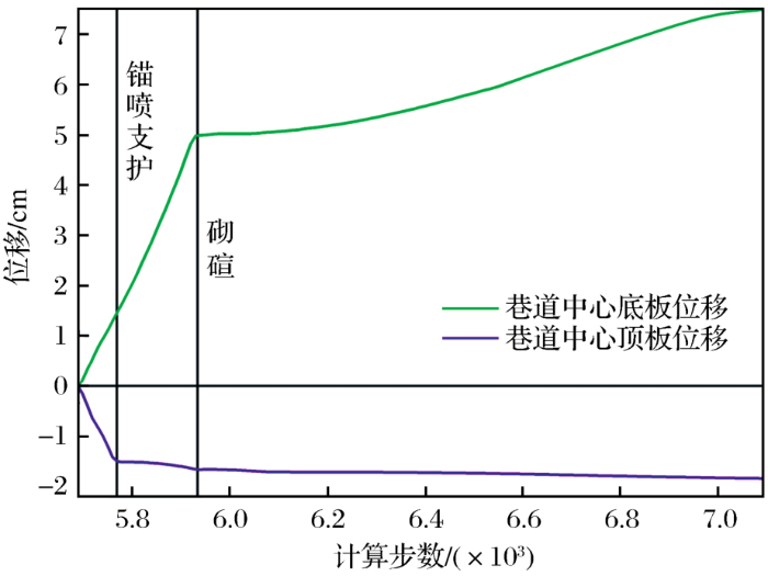 通过综合考虑各因素对各指标的影响,获得了极差分析的最佳支护方案:锚杆长度为2.8 m,喷射混凝土厚度为100 mm,碹体厚度为250 mm。由图5可以发现,巷道顶底板压应力集中现象得到缓解,压应力大小降低到4~6 MPa,支护体有效地缓解了顶底板应力集中现象。由顶底板位移曲线图(图6)和断层处支护体位移曲线图(图7)可知,巷道变形主要发生在开挖后、支护前。支护前底板发生的位移约为5 cm,支护后持续增长至7 cm左右,底板支护体发生变形,位移大小约为3 cm。巷道顶板下沉最大值为2.42 cm,两壁位移最大值在7 cm左右,均出现在支护与岩层相接处。进一步分析图7发现,支护后巷道变形继续发生,但总位移量得到了有效控制,变形趋势得到极大的减缓。