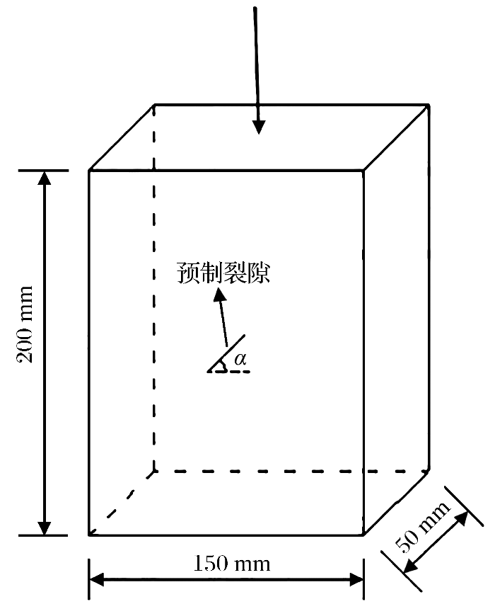 采用不锈钢模具制作类岩石试件,试件外形尺寸为200 mm×150 mm×50 mm(图1 ),α 为预制裂隙与水平方向夹角,箭头所示为加载方向,保证试样与上压头可以完全接触;采用预埋厚度为0.1 mm金属插片的方法预制贯通裂隙,裂隙长度为30 mm,在初凝时拔片,成型24 h后拆模,并检查裂隙贯通情况和表面的平整度,剔除破损和不合格试件。放入养护箱标准养护28 d后,用于加载试验。