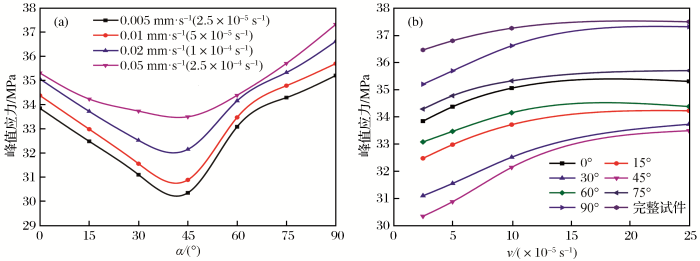 (a) 裂隙体峰值应力与倾角的关系; (b) 裂隙体峰值应力与加载速率的关系