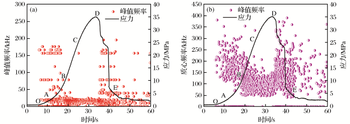 本节以应力—应变关系曲线为背景,基于声发射波形提取岩石破裂全过程中声发射的频域特征参数。图3 所示为75°裂隙体在加载速率为0.05 mm/s条件下,声发射峰值频率及质心频率与加载时间的关系图。质心频率是组成信号的所有频率的重心,单位为kHz;峰值频率为组成信号的所有频率的正弦信号中最大峰值的正弦信号对应的频率,单位为kHz。图3 (a)显示:峰值频率主要集中在0~25 kHz,50~75 kHz,150~175 kHz这3个频段,只有少数的峰值频率超过175 kHz。而图3 (b)中质心频率并没有明显的分频段集中,质心频率基本处于50 kHz之上。加载初期,声发射信号未过门限值40 dB,声发射特征参数未采集到,进入裂隙体微裂纹压密阶段(OA段)后,微裂纹破裂开始产生高频声发射信号[23 ] ;应力应变曲线进入线弹性阶段(AB段)后,峰值频率集中在中低频,质心频率集中活跃;从微破裂稳定发展阶段(BC段)到非稳定破裂发展阶段(CD段)的过程中,声发射活动进入一段时间的平静期,信号的频率越来越低,只有质心频率含有极少数的高频信号,峰值频率几乎全部集中在中低频,这是由于此时的破裂多为大尺度破裂,小尺度破裂占比变少,而小尺度破裂会产生高频波;峰值应力过后(DE段),岩体形成宏观主破裂,破裂尺度越来越大,AE峰值频率及质心频率达到峰值。声发射活动急剧增加后突然下降或出现相对平静期,预示着岩体的破坏,可以将低频信号占比逐渐升高作为裂隙类岩试件失稳前兆信息[19 ] 。