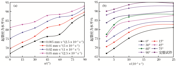 (a) 裂隙体起裂应力水平与倾角的关系; (b) 裂隙体起裂应力水平与加载速度的关系