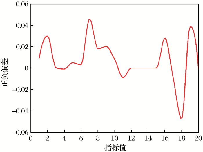 Step5:利用误差函数Ω = 1 n ∑ i = 1 n A ( i ) - F ( i ) A ( i ) 计算相对误差,其中A ( i ) 表示实际值,F ( i ) 表示预测值。将二者代入误差函数中计算相对误差值,当结果小于本文设定的正数,即ε =0.05时,学习过程结束,否则将返回第二步重新学习。本文将表2 的训练值输入系统,得到稳定的误差曲线,如图2 所示(横坐标为评价指标xi ,纵坐标为相对误差)。由图2 可知,学习误差在可控范围内,证明了模型的有效性。