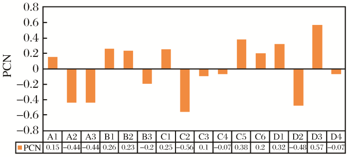 从图4 和图5 中可以发现,这些指标(A 1 ,B 1 ,B 2 ,C 1 ,C 5 ,C 6 ,D 1 和D 3 )的三阶偏联系数和四阶偏联系数均大于0。因此,这些指标不会一直向较差状态方向发展,而是呈现此起彼伏的发展趋势。根据偏联系数,可以准确确定每个评估指标状态的动态发展趋势。同时,可以提出有针对性的预防性维护措施,以达到提高系统可靠性的目的。