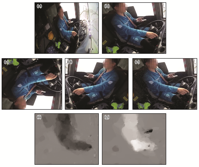 (a)原始帧图像;(b)剪裁后的图像;(c)旋转图像;(d)翻转图像;(e)添加噪点的图像;(f)X方向光流图;(g)Y方向光流图