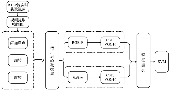 在双流网络结构的基础上,利用迁移学习等方法改变基础网络结构,利用三维卷积神经网络和经过预训练的VGG16提取时域和空域特征,然后进行融合、分类,从而得到更准确的测试结果。具体步骤如下: