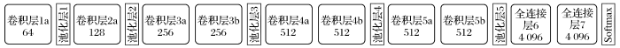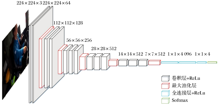VGG16是分类网络模型中较为经典的网络,相比之前的卷积神经网络,其改进在于采用连续的几个3×3的卷积核代替较大卷积核(11×11,5×5)。由于多个非线性层增加了网络的深度,以确保学习更复杂的模式并具有少量参数,因此对于给定的感受野,采用较小卷积核要优于大的卷积核。VGG16网络结构如图5所示。该网络模型输入尺寸为224×224×3,由13个卷积层、5个池化层、3个全连接层和1个Softmax层组成。