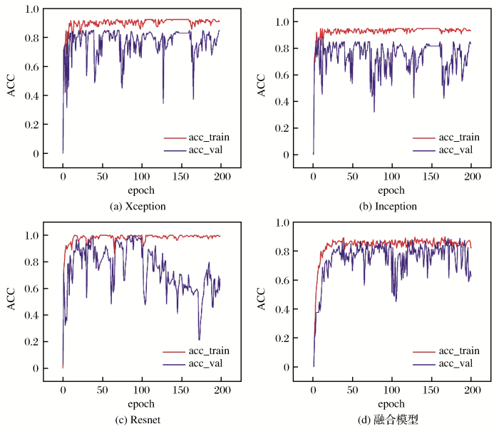 由图9可知,经过200轮训练后,4种模型的训练结果并不理想,均维持在0.90~0.95之间,特别是验证准确率波动较大,在Resnet中甚至出现验证准确率回落的情况。其中融合模型在混合了3种模型结果后的表现比单一模型的结果更好、更稳定,但是不明显。分析其原因可能是对于行为识别来说,只考虑静态信息的模型并不能很好地提取有用特征,造成结果波动较大,因此传统的分类模型并不适用于行为识别任务。