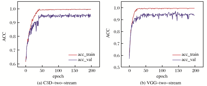 由图10可知,经过200轮训练后,2个模型的训练准确率均超过99%,验证准确率达到95%左右,其中C3D-two-stream模型在训练到50轮左右趋于最佳,且验证集拟合效果较好,稳健性较强,而VGG-two-stream模型的验证准确率波动较大,分析其原因可能是C3D模型采用的三维卷积,在卷积过程中能获取时域信息,并在双流结构中再一次对时空域特征进行融合处理,相比VGG的二维卷积在帧图像提取特征过程中无法获取时域信息更具优势。