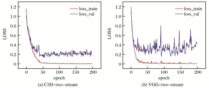 网络训练的损失图像如图11所示。训练损失均达到0.01以下,得到比较好的拟合效果,但是可以看出VGG-two-stream的验证损失波动较大,与验证准确率波动较明显相对应。