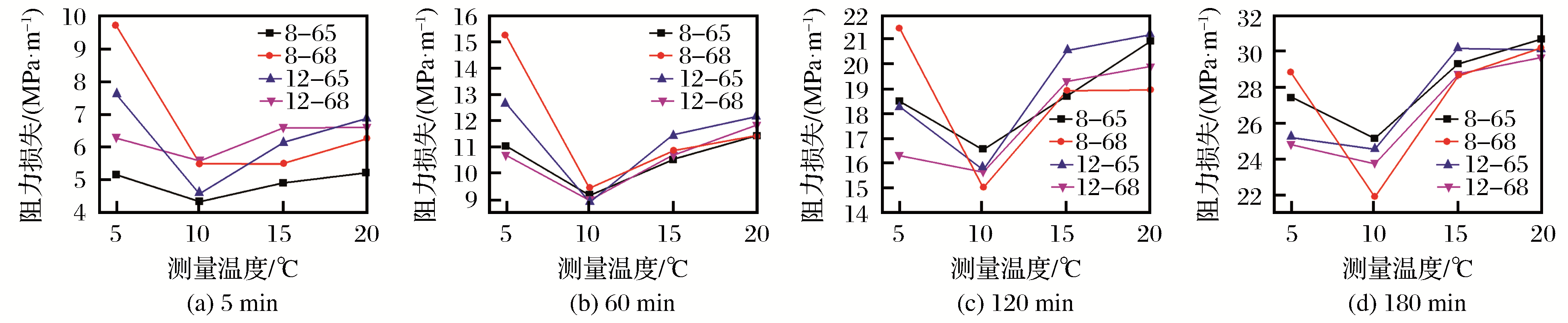 不同配比、温度下阻力损失变化曲线