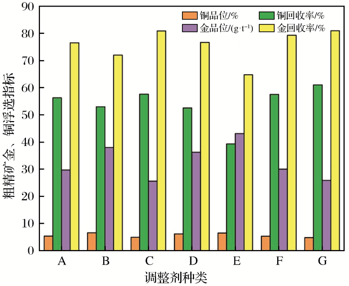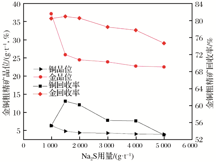 由图3可知,当Na2S+CuSO4作为组合调整剂时,可获得金品位为25.88 g/t、金回收率为80.92%,铜品位为4.81%、铜回收率为61.02%的金铜粗精矿。相比于其他调整剂,该调整剂组合可获得较高的铜、金回收率,故选用作为组合调整剂。