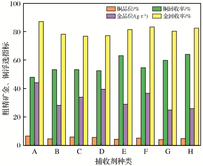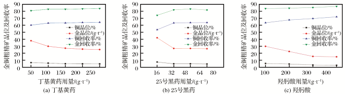 由图7(c)可知,随着羟肟酸用量的增加,金铜粗精矿金、铜回收率有所上升,当羟肟酸用量为200 g/t时,可获得金品位为22.50 g/t、金回收率为84.16%,铜品位为4.64%、铜回收率为67.46%的金铜粗精矿;继续增加羟肟酸用量,金、铜品位均有所下降。因此,选用羟肟酸用量为200 g/t。