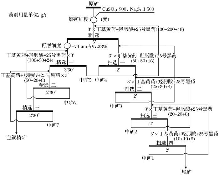 (2)闭路试验结果表明:在磨矿细度为-74 μm含量占80%,Na2S作硫化剂,CuSO4作活化剂,丁基黄药、羟肟酸及25黑药作捕收剂的条件下,经一次粗选,粗精矿再磨后三次精选,四次扫选,可获得金品位为86.65 g/t、金回收率为89.11%,铜品位为16.93%、铜回收率为71.92%的金铜精矿,其中银品位为216.24 g/t,银回收率为87.26%。