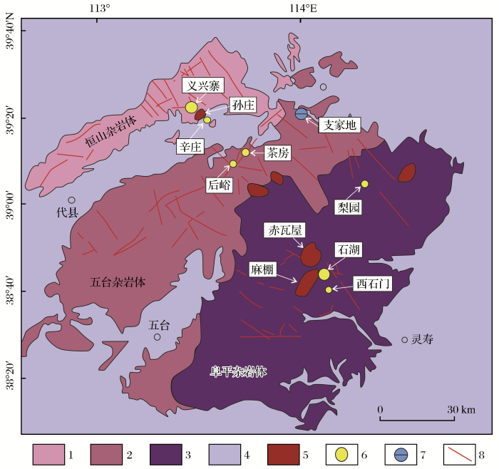 1.太古代恒山群杂岩体;2.太古代五台群杂岩体;3.太古代阜平群杂岩体;4.新生代地层;5.新生代花岗岩;6.金矿床;7.银(铅锌)矿床;8.断裂