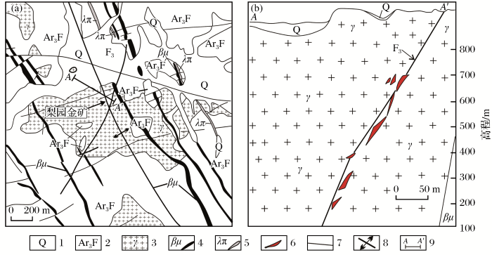 梨园金矿地质简图(a)和A-A′矿体剖面图(b)(据王斌峰等,2015修编)