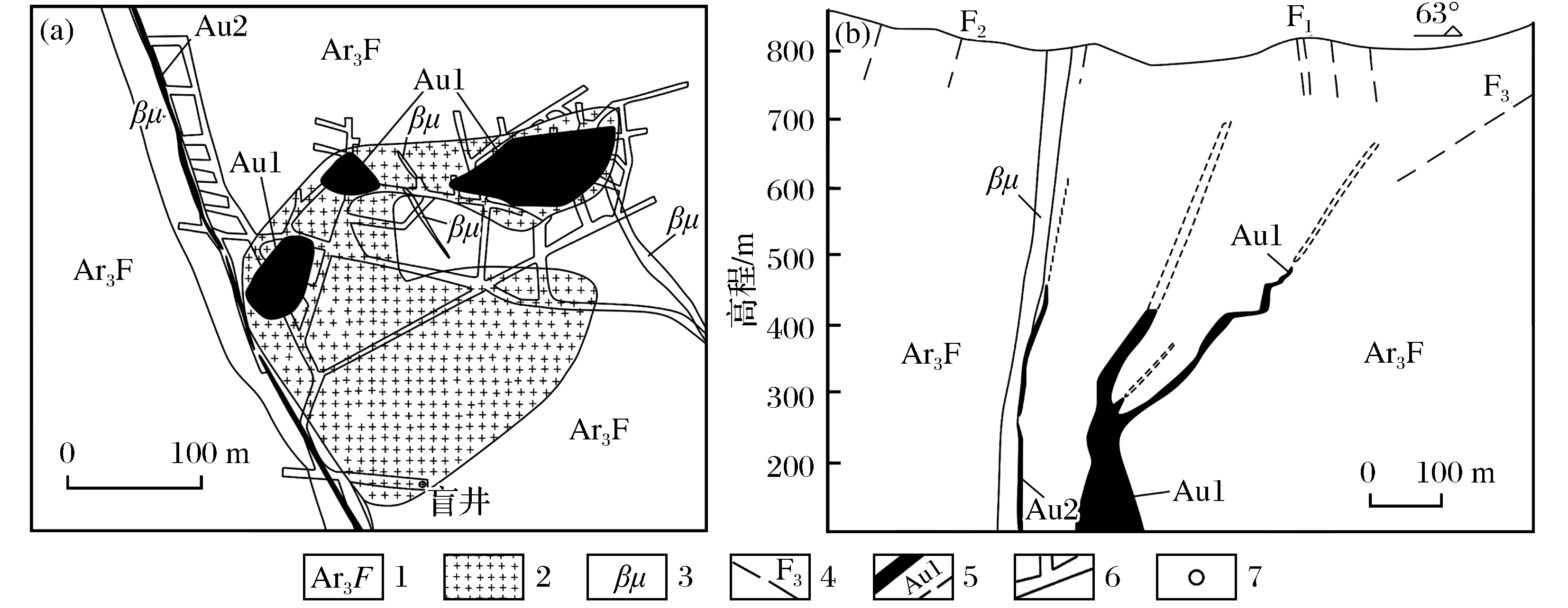 | 图3 梨园金矿十三中段地质简图(a)和22勘探线剖面示意图(b) 1.阜平群混合岩化条带状片麻岩夹斜长角闪岩;2.粗粒钾长文象花岗岩;3.辉绿岩;4.断层及编号;5.矿体(推测)边界及编号;6.巷道/中段;7.盲井 |