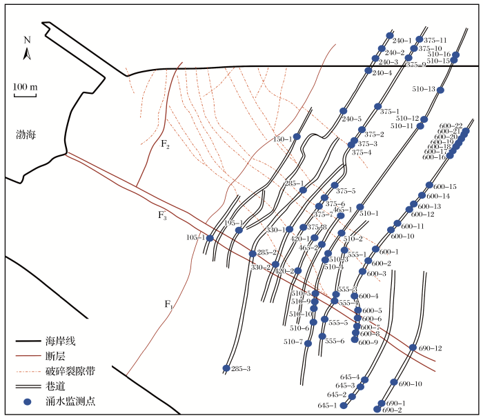 研究区内主要发育有3条断裂带,分别为F1、F2和F3,如图1所示。F1为压扭性断裂,是纵贯矿区的控矿构造,总体走向NE40°,倾向SE,倾角为38°,倾斜延深1 000 m以上,为隔水断层。矿体产于F1下盘断层的蚀变岩内,产状与F1基本一致。F2为导水性良好的张性断裂,北部入海,南端被第四系覆盖。F3是张扭性断裂,是矿区内最大的一条导水断裂带,切割含矿蚀变带及F1断层,向北西端伸入渤海,其不仅局部破坏了F1的隔水层,而且沟通了海水与采区的联系,造成采矿坑道大量涌水。
