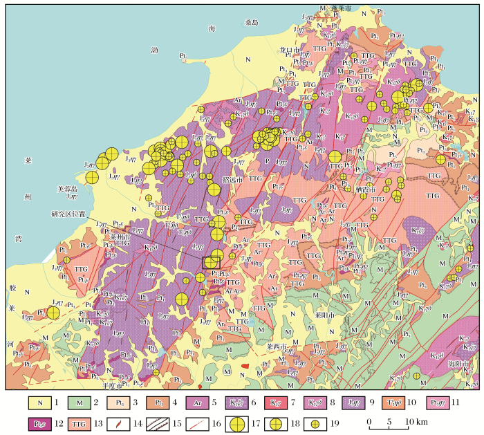 1.新生界;2.中生界;3.新元古界;4.古元古界;5.太古宇;6.早白垩世伟德山花岗岩;7.早白垩世郭家岭花岗闪长岩;8.晚侏罗世中细粒二长花岗岩;9.中侏罗世文登花岗岩;10.三叠纪花岗岩;11.新元古代二长花岗岩;12.古元古代中基性侵入岩;13.太古宙TTG质花岗岩;14.中酸性岩脉;15.地质界线、角度不整合界线及平行不整合界线;16.断层;17.大型原生金矿;18.中型原生金矿;19.小型原生金矿