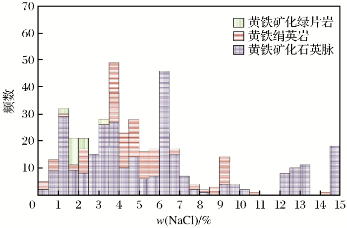 (2)盐度:盐度由核工业北京地质研究院分析测试研究中心在流体包裹体显微测温检测报告中给出,未提交原始测试数据,本文直接引用其测试结果。夏甸金矿包裹体的盐度[w(NaCl)]介于0.5%~15.0%之间,主要分布在1.0%~7.0%之间(图5)。含金黄铁矿化(多金属硫化物)石英脉中包裹体盐度具有贯通性,即从低到高均有显示,说明尽管盐度是同一个数量级变量,但随着成矿作用从早期到晚期,含金黄铁矿化(多金属硫化物)石英脉金质的沉淀作用始终是发生的,黄铁矿和石英是与金矿化关系最密切的矿物之一,也是研究金质沉淀最重要的载体矿物。黄铁绢英岩中包裹体盐度含量变化范围为0.5%~11.0%,且集中在3.5%~6.5%之间,说明与金质沉淀有关的黄铁绢英岩化的盐度是中低盐度,低盐度更有利于金质的沉淀析出。在夏甸金矿中,由于花岗岩化交代荆山群而残留的角闪质岩石经构造作用后形成角闪片岩和角闪糜棱岩,而后经矿化蚀变形成黄铁矿化绿片岩金矿石,说明角闪质岩石较花岗质岩石更不易交代蚀变,因而其盐度集中在较低的盐度区间(1.0%~3.5%),显示一种后期或晚阶段的矿化蚀变现象。