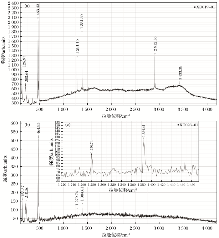样品分析由核工业北京地质研究院分析测试研究中心完成。流体包裹体测试仪器为Linkam THMS600型冷热台,测试依据为《矿物流体包裹体温度的测定》(EJ/T1105-1999),测试外部环境温度为26 ℃,湿度为50%;样品编号为7035。包裹体成分采用LABHR-VIS LabRAM HR800型仪器分析,测试外部环境温度为25 ℃,湿度为50%,Yag晶体倍频固体激光器,波长为532 μm,扫描范围为100~4 200 cm- 1。