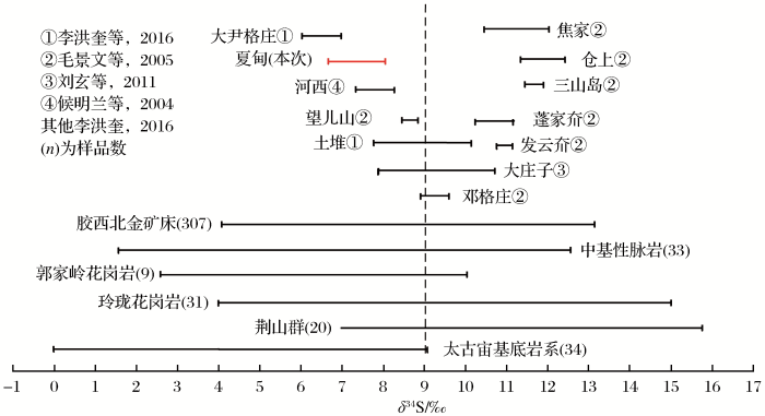 夏甸金矿床黄铁矿δ34SV-CDT值集中在+6‰~ +8.1‰之间,变化范围较窄。毛景文等(2005)发表的δ34S数据如下:三山岛金矿床(3个样品)介于 +11.2‰~+11.9‰、仓上金矿床(4个样品)介于 +11.7‰~+12.5‰、焦家金矿床(5个样品)介于 +10.1‰~+12.29‰、望儿山金矿床(5个样品)介于 +8.5‰~+8.9‰、邓格庄金矿床(4个样品)介于 +8.8‰~+9.6‰、蓬家夼金矿床(5个样品)介于 +9.9‰~+11.3‰、发云夼金矿床(5个样品)介于 +10.7‰~+11.1‰。刘玄等(2011)研究得到大庄子金矿床(6个样品)δ34S值介于+7.9‰~+11.3‰。侯明兰等(2004)研究得到河西金矿床(5个样品)δ34S值介于+7.5‰~+8.5‰。张连昌等(2001)发表的δ34S数据如下:玲珑花岗岩(12个样品)介于+6.1‰~ +10.1‰、胶东岩群(5个样品)介于+7.2‰~+7.6‰。这与前人(李洪奎等,2016;王义文等,2002)对胶东地区金矿床S同位素组成以变异小和富集34S为特征的研究结果相一致,说明胶东金矿中黄铁矿的S同位素组成具有相似性(图9),以富集重硫为特征。