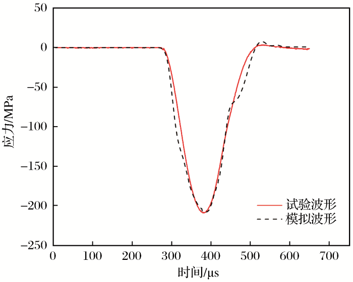 对含有节理的试样模型细观参数进行标定时,将光滑节理(SJ)模型(Mehranpour et al.,2017)赋予节理面两侧颗粒,非节理面颗粒仍然赋予PB模型。然后根据其他学者的研究(Mehranpour et al.,2017;胡万瑞,2017)初步选定节理面参数,反复对节理试样进行模拟冲击试验,不断调整模型参数,直至数值模拟得到的应力波波形与物理试验所得波形一致。最终校准的节理试样细观参数见表3,波形结果对比见图4。