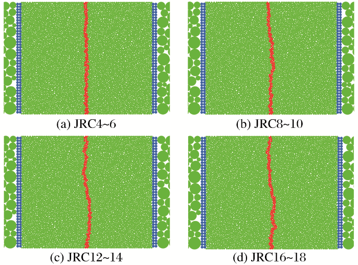为此,许多学者从理论和试验方面对应力波在节理裂隙中的传播问题进行了一系列的研究。Zhao et al.(2001)和俞缙等(2007,2008)在线弹性位移不连续理论(Schoenberg,1980;Pyrak-nolte et al.,1987)的基础上发展改进了节理非线性位移不连续理论(王卫华等,2006),并对节理的相关参数进行了研究。节理面的粗糙程度与节理岩体的动态力学特性及应力波在节理面的传播规律密切相关。为了模拟实际节理面,学者们进行了大量室内试验研究。Barton et al.(1977)通过倾斜和拉压等试验提出用粗糙度系数(JRC)描述节理面的起伏程度,并给出10种典型的节理剖面,对应JRC取值范围为0~20;谢和平(1992)提出用分形几何的概念描述节理的粗糙度,量化了节理的粗糙程度;Li et al.(2011)考虑分形几何描述节理粗糙程度,进一步建立了分形损伤节理模型,利用激光表面仪和SHPB试验系统研究了节理面分形维数与应力波透射、反射系数的关系;Li et al.(2017)采用SHPB试验系统研究了节理吻合系数(JMC)(赵坚,1997)对岩石节理动态特性及应力波传播的影响。在模拟试验方面,Resende et al.(2010)利用PFC软件模拟应力波与节理岩体的相互作用,研究了应力波在岩体中传播的微观过程及过程中节理几何形状的变化;曾超等(2018)应用PFC软件研究了节理接触面积和节理厚度对应力波传播特性的影响。一些学者通过在PFC软件中建立SHPB系统数值模型,对应力波传播的微观过程进行了研究。Li et al.(2014)建立了基于PFC的SHPB系统数值模型,对完整试样进行了不同速度下的冲击试验,研究了应力波在霍普金森杆中的传播过程以及试样的破坏过程,从微观上揭示了SHPB试验中试样的动态响应; Zhou et al.(2017)运用SHPB试验系统颗粒流模型,研究了岩石在冲击载荷下的破坏过程及内在机理;Qiu et al.(2017)运用PFC软件,对不同倾角的层状岩石进行了SHPB数值冲击试验,研究了层状岩石的动态破裂特性。以上研究没有进一步分析应力波在不同粗糙度节理中传播的微观机理,也没有对比不同粗糙度的节理试样微观破坏特征。