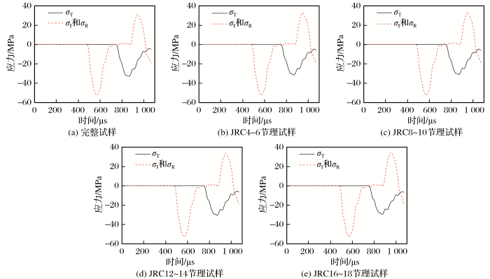 图6为完整试样、JRC值为4~6的节理试样和JRC值为16~18的节理试样入射端、透射端应力和应力平衡因子随时间的变化曲线。从图中可以看出,应力波在各试样内传播的过程中,应力平衡因子经历了相似的不同变化阶段,以t1到t5时刻为特征点,将试样应力状态划分为5个变化阶段,描述如下:①在t1~t2时间段,应力波开始到达试样入射端,并向透射端传播,应力波传播过程中,入射端应力不断增大,透射端应力为0 MPa,因此,应力平衡因子维持2不变;②在t2~t3时间段,应力波开始到达试样透射端,并在透射端发生透反射,反射应力波向入射端传播,在此时间内应力波在试样中往复传播,在节理面、入射端和透射端不断发生透反射,应力平衡因子逐渐减小,并趋于0;③在t3~t4时间段,从应力平衡因子首次达到零值,到试样两端应力达到峰值,整个过程中应力平衡因子波动起伏较缓,说明试样到达稳定的应力平衡状态;④在t4~t5时间段,应力峰值过后,应力平衡因子仍能维持在零值上下,但波动明显强于上一时间段,在应力接近0 MPa时,虽然两端应力差值逐渐减小,但比值相对较大,显现出应力平衡因子的剧烈波动,这一时段应力平衡因子的变化说明在峰后阶段试样未受到破坏,仍能够作为一个整体承受应力载荷。⑤在t5之后的时间段,应力平衡因子为2,说明试样透射端已与透射杆分离,透射端应力为0,入射端仍有部分颗粒与入射杆接触。