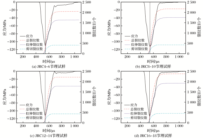 (5)由表5可知,当入射应力相同时,节理越粗糙,节理的动态强度越低,节理试样越容易破坏,产生的裂纹数目越多。节理试样JRC值从4~6增加至16~18时,节理试样的强度随之降低,最终产生的裂纹数目则由2 050个增长至2 377个。