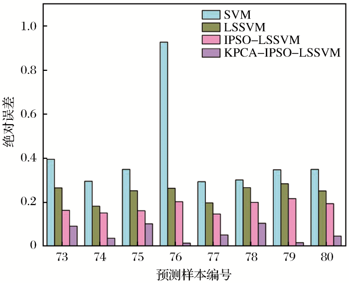 为了综合比较KPCA-IPSO-LSSVM模型的预测效果,本文采用平均相对误差(MRE)、均方根误差(RMES)和判定系数(R2)3项评价指标对预测结果进行对比分析,计算公式如下: